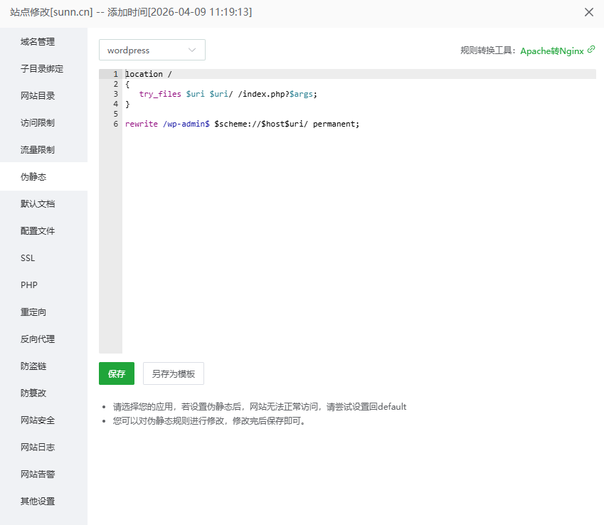 4、更改固定链接后,需要开启伪静态才可以正常访问,